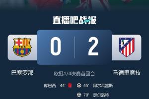 体育资讯04月09日讯 欧冠1/4决赛首回合结束,巴萨0-2马竞,皇马则1-2拜仁。